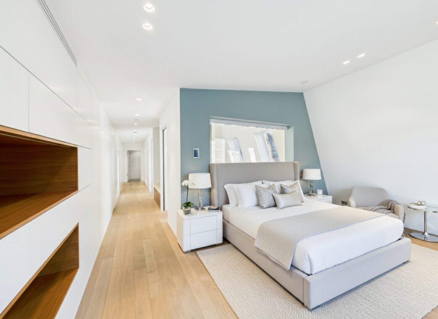 Die untere Etage (4. OG) verfügt über eine hochwertige Einbauküche mit festverbautem Schiefer-Esstisch, Gaggenau-Geräten, einem Quooker Wasserhahn, Weinkühlschrank, kleiner Bar und einer unauffällig in die Einbauschränke integrierten Vorratskammer. Von der Küche aus, mit eigenem Balkon, ist der Übergang zur Bibliothek fließend. Des Weiteren beherbergt die untere Etage drei großzügige Schlafzimmer, davon hat eines direkten Zugang zur Dachterrasse mit Sonnensegel (Nord-West-Ausrichtung). Ebenfalls auf dieser Etage vorhanden sind drei luxuriöse Badezimmer, zwei davon en Suite, und mit ebenerdigen Duschen sowie Armaturen von Dornbracht ausgestattet. Im Masterbad mit Wanne, Regendusche und Sauna lässt es sich wunderbar entspannen.