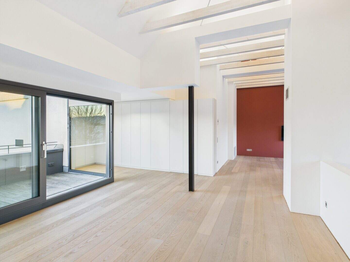 Die offene Gestaltung der Räumlichkeiten mit ihren hohen Decken schafft ein lichtdurchflutetes und weitläufiges Ambiente. Über das integrierte BUS-System (Gira KNX) lassen sich Beleuchtung, Multimediaausstattung (Unterputzlautsprecher, Basalte Musikserver), Heizung und Sonnenschutz steuern.